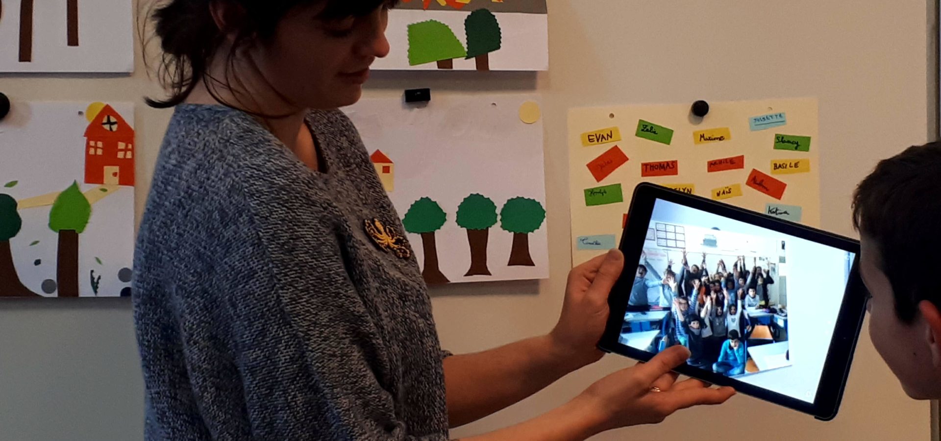 Les enfants sont accompagnés tout le long de la résidence par Lola Chanut et Lucile Blanchemanche d’Electroni[k]. Les deux intervenantes font passer les groupes un par un afin de leur montrer comment l’application HP-Reveal permet de fusionner les vidéos en stop motion avec les décors papiers afin de créer la réalité augmentée.