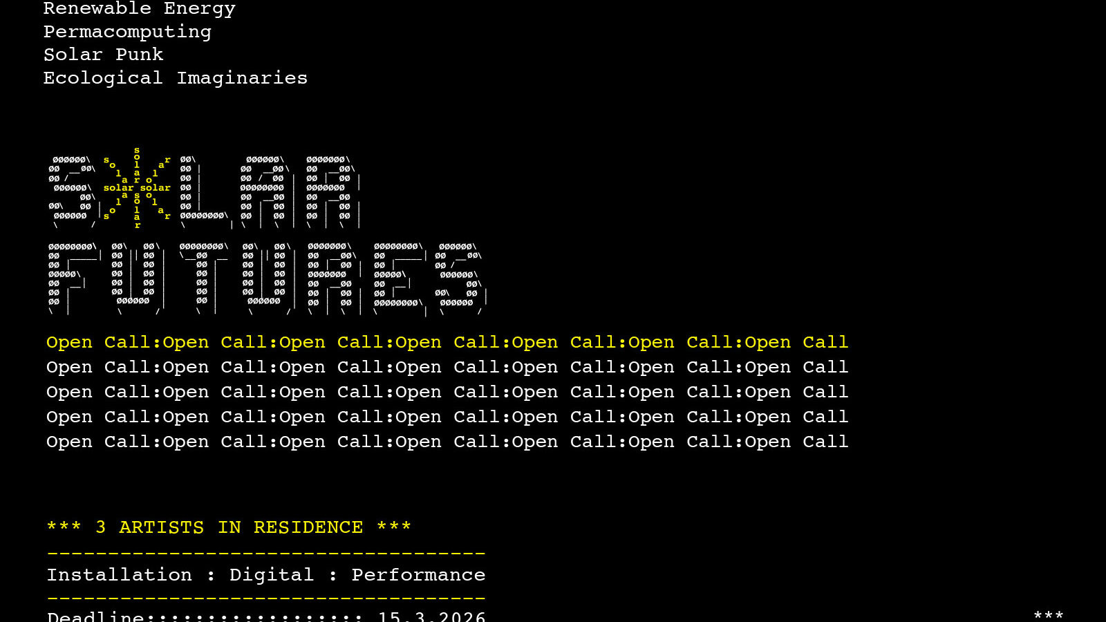 SOLAR FUTURES est une collaboration soutenue par Creative Europe qui rassemble quatre organisations culturelles qui travaillent à la croisée de l’art, de la science et de la technologie : OHME (Belgique) en collaboration avec Electroni[k] (France), iii (Pays-Bas) et LEV Festival (Espagne), en partenariat avec deux universités associées, l’Université Libre de Bruxelles (ULB) et la Vrije Universiteit Brussel (VUB), afin de soutenir des pratiques artistiques transdisciplinaires qui imaginent des futurs alternatifs et désirables.