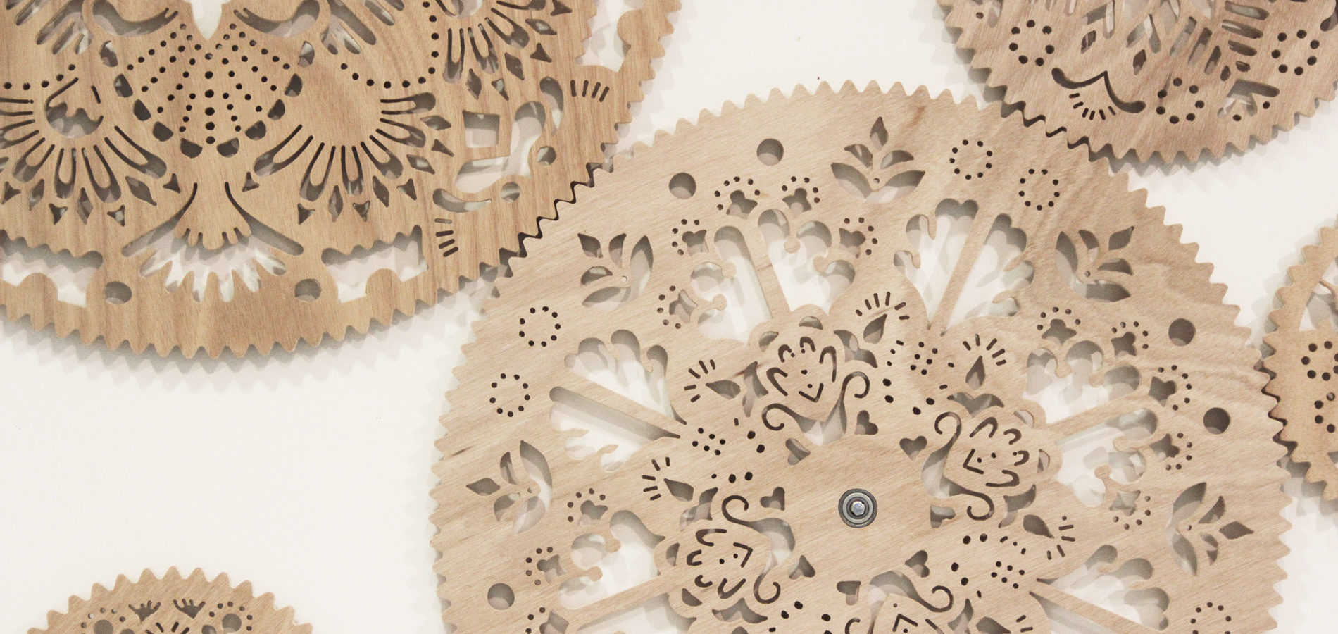 Rouages est une œuvre modulable qui s’adapte aux lieux dans lesquels elle se déploie. Elle est constituée de 40 cercles en bois dentelés, ornés de motifs découpés. Une des pièces est actionnée et entraîne avec elle l’ensemble des rouages dans un mouvement régulier et lent.