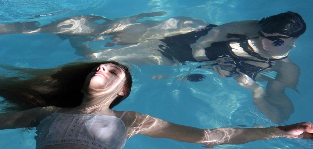Sehila s’apprête à débuter le tournage de la dernière scène du clip avec une caméra GoPro étanche, dans une piscine de kinésithérapie.
