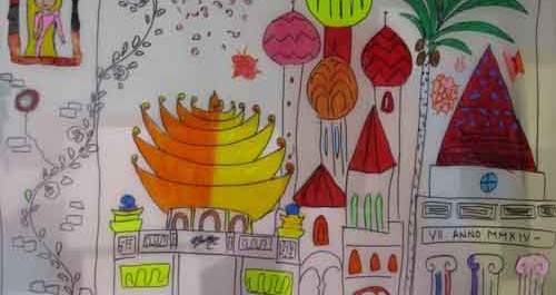 Quand on a 7 ans, on n’a pas toujours en tête toutes les modèles d’architecture. Les enfants ont donc a leur disposition des petites images de bâtiments, palais et maisons du monde entier. Les plus demandés sont : la Tour Eiffel, le palais d’Aladdin, la tour de Raiponce et la Grand Muraille de Chine. S’y ajoutent rapidement des habitants (beaucoup de princesses évidemment), des végétaux, des fées et des papillons. Les sucreries s’invitent également, au travers de sucettes géantes et de châteaux en pain d’épice. Au final, ce sont de merveilleuses compositions que les enfants dessinent.