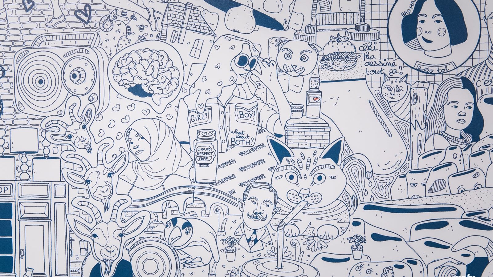 La fresque murale de 12m2, offre à voir une véritable jungle graphique, composée de centaines d’éléments, de personnages, de détails et références cachées qui invitent le spectateur à une exploration contemplative sans fin. À cette installation, répond en miroir une version au sol, composée de 48 de dalles de linoléum, dont le public peut facilement s’emparer, pour faire et défaire ce puzzle géant et tenter de reproduire le format initial du Dessin sans Fin présenté sur Instagram !